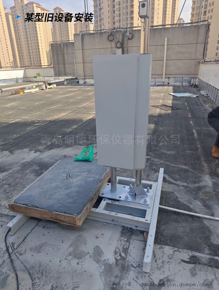 以某安装点位楼顶为例,业主的某型旧设备安装采用水泥墩压槽钢支架的形式,因水泥具有腐蚀性和碱性,施工过程和日常使用中会对业主楼顶防水层造成破坏。因此,明德噪声采用创新工艺,另辟蹊径,使用无腐蚀性的落地座方案(内部增加配重),在保护业主楼顶防水层的同时,拥有优异的结构稳定性,抗风能力强,也便于安装施工。